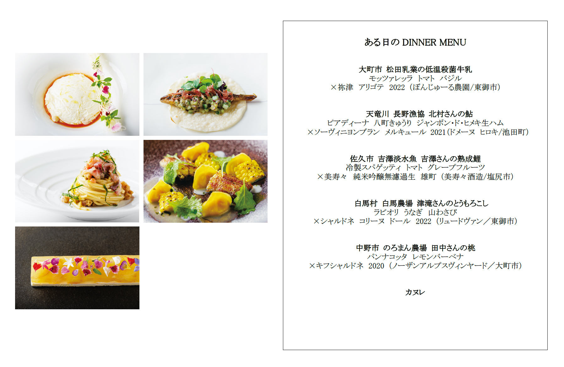 地域の食材にこだわった一皿ひとさらに、長野ワインをペアリングさせたオープン以来の人気のメニューB. 信州テロワールコース(8皿)から、「コース料理は量が多い」とご負担に感じていらしたお客さまのために、皿数を減らしたコースです。