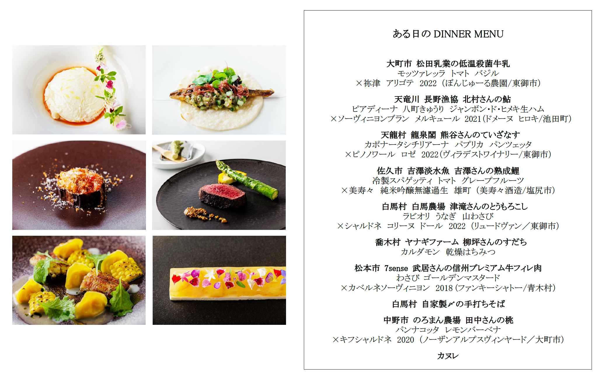 2019年のオープン以来、みなさまにお楽しみいただいてきたFIELD SUITE HAKUBAの定番のコース。地域の食材にこだわった一皿ひとさらに長野ワインをペアリングさせた人気のメニューです。