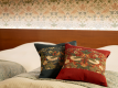 イギリス製の壁紙に、ヘッドボード、クッション、ベッドスロー等に