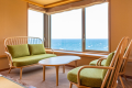 和室10帖+6帖の次の間に、広い踏み込みと海を眺める広縁付き、トイレも2箇所、全79㎡のゆとりの空間。源泉掛け流しの露天風呂からは水平線まで続く海と伊豆大島を望み、内風呂は心安らぐ檜風呂。