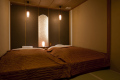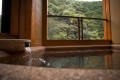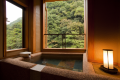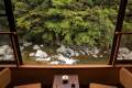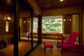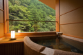 渓流を眼下に望む特等席に半露天風呂付客室。有名建築家の手による、デザイナーズ客室です。浴槽から眺める渓流のせせらぎと、夜空に輝く満天の星につつまれて、 ゆったり癒しの時間に身をゆだねてみてください。