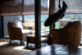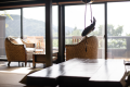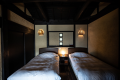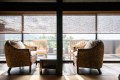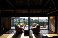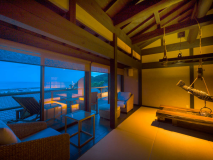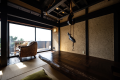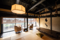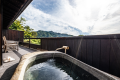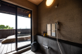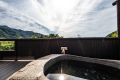 テラスに面して幅広い窓と広縁をもつ平屋タイプ。囲炉裏を備えた和室とベッドルームがつながって、ジャパニーズモダンに満ちています。大きな岩をくり抜いた湯舟の露天風呂を備えたテラスの先には豊かな緑が広がります。