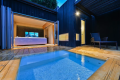 デッキを含むと約80㎡の広さ、寝具には特にこだわり 肌触りが感動モノの「パーケルシーツ」に和布団、露天風呂の湯船は白。日差しの強い昼になったら綺麗な水色へ変化しリゾート気分を盛り上げます。