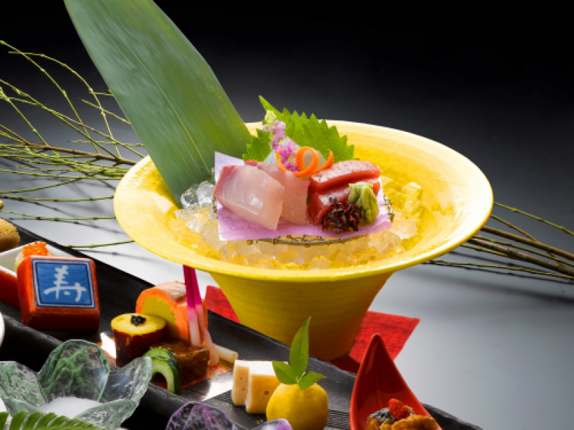 お食事会場にて季節の創作和食膳+ハーフバイキングへ変更いたします。