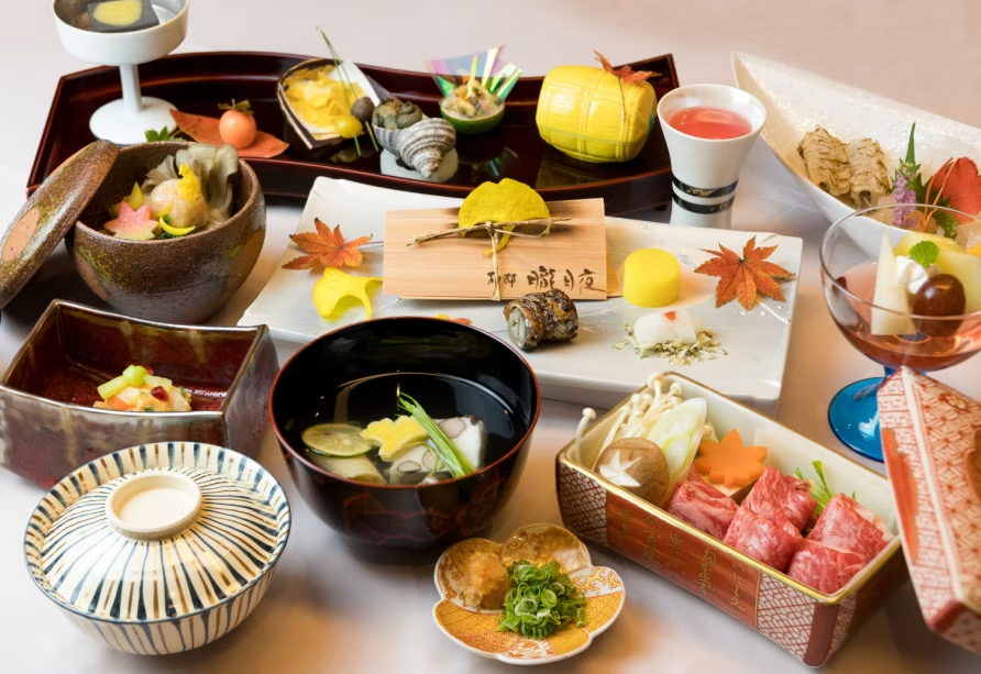 - 個室料亭「二十三夜」にて、旬の食材をふんだんに使用した懐石料理をご用意。 地産地消にこだわった四季折々の贅をご堪能ください。