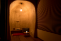 嬉野川沿いの窓際には洞窟のようなくつろぎスペースとソファ。