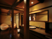 区切られているようでいない二間客室。それぞれ8畳の和室と寝室(ベッド)は襖で仕切られており、その2部屋を繋ぐ広く機能性に優れた洗面スペースを設けている。