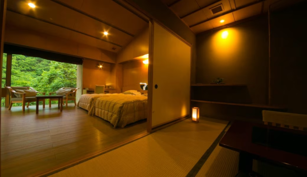 和室とゆったりとしたツインルームの二間、露天風呂を設えたお部屋でございます。大きな窓と開放的な露天風呂から、豊かな自然をお愉しみください。