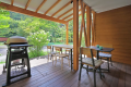 グランピング気分を味わえるBBQテラスはもちろん、好奇心をくすぐるボルダリングの壁や四万温泉の源泉を引いた檜の露天風呂までお楽しみいただけるプライベート空間になっております。