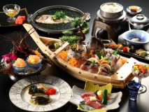 - “基本”【海女笛会席】ぷりぷり伊勢海老二品に漁師町の大漁舟盛り+黒毛和牛♪名物ふわふわ鯛香草蒸し