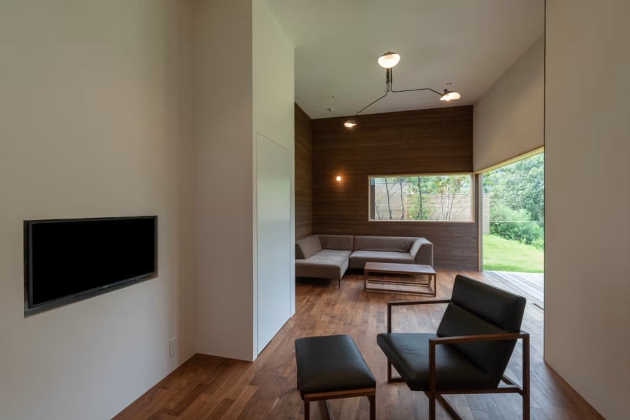 白一色で統一した建築から望む、ガラス越しの光と緑の木々。