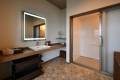 そよ風館の2階にあるフロントロビーと同じ階で、エレベーター近くのお部屋。移動に便利なお部屋でございます。高齢者や車椅子ご利用のお客様も快適にお過ごしいただけるユニバーサルデザイン設計(バリアフリー)、室内は段差なく、また、化粧室まで車椅子でもストレス無くご移動いただけるよう、ドアはございません。