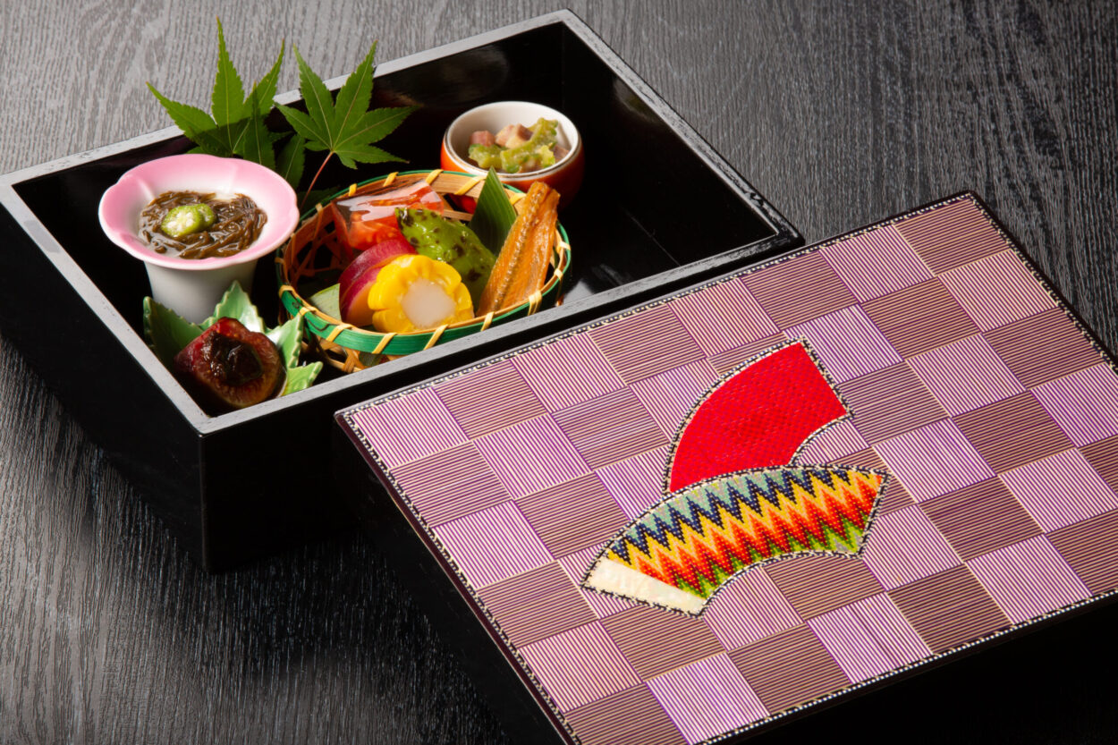 城崎温泉の伝統工芸品「麦わら細工」は、300年余りの歴史がある工芸品です。かみや民芸店の神谷氏に製作していただいた麦わら細工の器に八寸を盛り込みました。