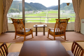 日当たりの良い南向きの居室には、広々とした12.5畳の和室その先の広縁には東京青山「BC工房」の椅子が鎮座し、目の前に広がる昔話のワンシーンのような山並みと田園風景は、郷愁を感じさせます。