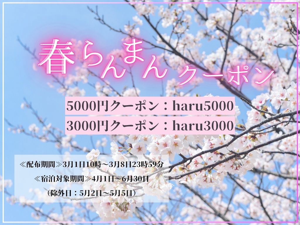 5,000円クーポン : クーポンコード:haru5000 (1予約あたり30,000円(税込)以上のご宿泊料金)