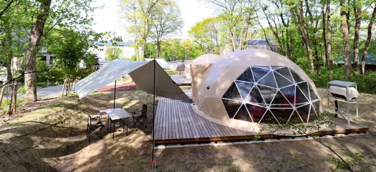 自然の中にも溶け込む斬新なデザイン。グランピング施設には欠かせないホテルテントです。
