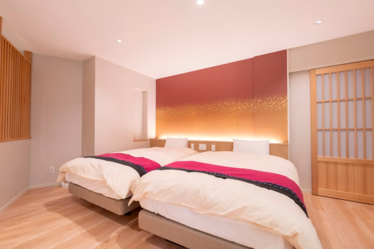Room Facilities: Two Semi-double(small-double) Beds manufactured by Simmons Co Ltd, Free WiFi, Yukata Robes, Safe, Air conditioning, Heating, Toilet, TV, Refrigerator, Electric kettle.