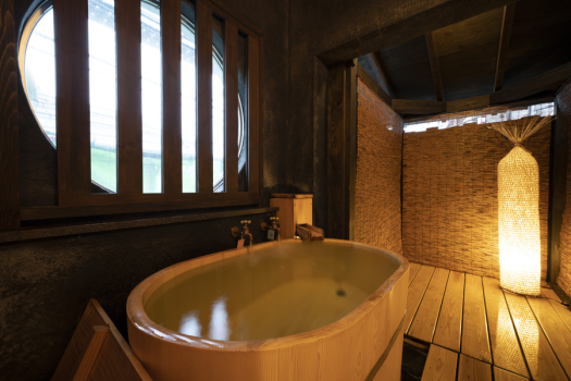 The private bath offers a hot spring "Onsen" with added water to adjust the volume and temperature.