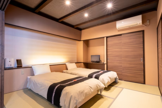 Non Smoking room featuring Tatami (woven-straw) living area, Western-style bed area, study area and Private Onsen Bathroom. Room Facilities: Two Single Beds manufactured by Japanese Francebed Co Ltd, Free WiFi, Yukata Robes, Safe, Air conditioning, Heating, Toilet, TV, Refrigerator, Electric kettle.