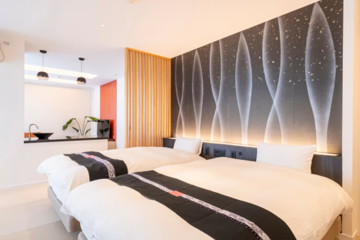 Room Facilities: Two Semi-double(small-double) Beds manufactured by Simmons Co Ltd, Free WiFi, Yukata Robes, Safe, Air conditioning, Heating, Toilet, TV, Refrigerator, Electric kettle.